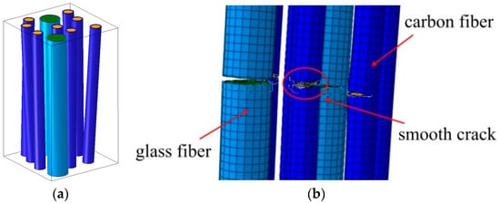 Micromechanical model of hybrid glass/fiber composites (a); and the simulated fiber failure (b). Reprinted from [41,42] with kind permission from Elsevier.