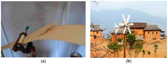 An interesting option for developing countries is small turbines, producible on-site, and made from “natural composites”, i.e., from locally available timber [47]. In a series of investigations, a group of Nepali, Danish and Australian scientists studied the applicability of different timbers for wind turbines, and demonstrated that the turbines with wooden blades represent a reliable and low cost option for the developing countries [48,49,50,51]. Figure 5 shows a test of a timber wind turbine blade and small wind turbines installed in a village school in Nepal.