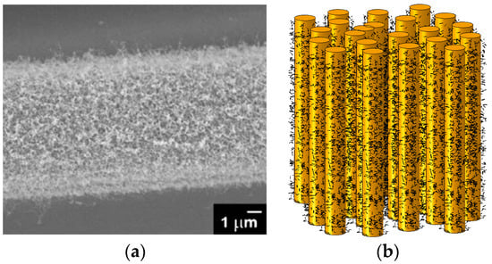Micrograph of a carbon fiber with CNT reinforcements in fiber-matrix interface (a) and computational model of a composite with secondary CNT particles (b). (Reprinted from [65,69] with kind permission from Elsevier).