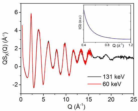 X-ray diffraction structure factors Q∙SX(Q) measured on the 2015 amorphous hafnia sample obtained using incident X-ray energies of 131 keV (black) and 60 keV (red). (Inset) Small angle scattering (Q = 0.4–1.2 Å−1) measured at 60 keV (blue) and fit corresponding to the equation y = a + b∙Q−3.94 (dashed line).