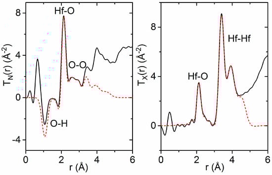 Simultaneous Gaussian fits (dashed red) to the measured total pair distribution functions (solid black), assuming a composition of (HfO2)0.9· (H2O)0.1. (Left) Total pair distribution function obtained from neutron data, TN(r). (Right) Total pair distribution function obtained from X-ray data, TX(r). The negative dips at 1.1 Å and 1.8 Å are assigned to intra-molecular hydrogen bonds in water and O–H groups within the amorphous hafnia network.