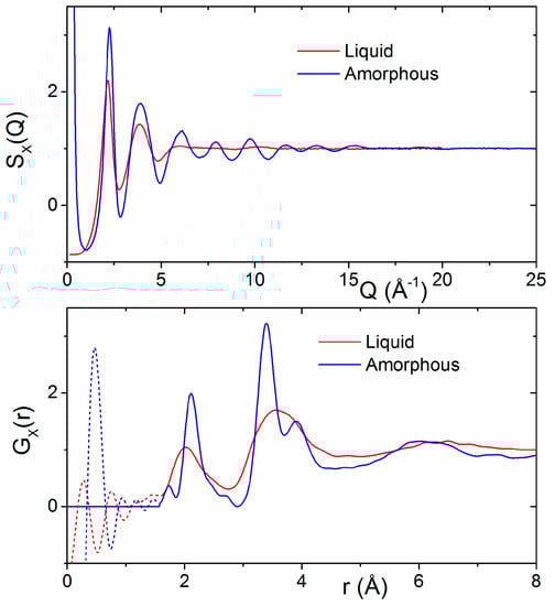 where ρ is the atomic number density and G(r) is the pair distribution function as defined by the Hannon–Howells–Soper formalism (Equation (30) in ref. [16]). In this manuscript, both G(r) and T(r) definitions are used: G(r) highlights the local structure and is readily comparable to simulation results, while T(r) emphasizes intermediate range ordering and allows for extraction of coordination numbers.