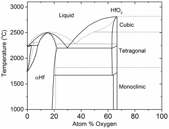 The phase diagram of the Hf–O system has been studied extensively as part of an effort to understand thermal stability in refractory materials [43,44,45]. A phase diagram was proposed in 1990 based on thermodynamic data available at the time [46]. The phase diagram is complex, involving large solubility domains, eutectic and peritectic points, and allotropic phases of HfO2 (Figure 6). In addition, the Hf–O binary was assessed as part of thermal equilibria studies of ternary systems such as Hf–Si–O and Zr–Si–O. A more recently proposed phase diagram incorporates density functional theory (DFT) calculations and thermodynamic CALculation of PHAse Diagrams (CALPHAD) in addition to experimental information [47,48]. Further studies, also based on DFT methods, established the relative stabilities between monoclinic, tetragonal, and cubic phases of HfO2 with respect to cation dopants or oxygen vacancies.