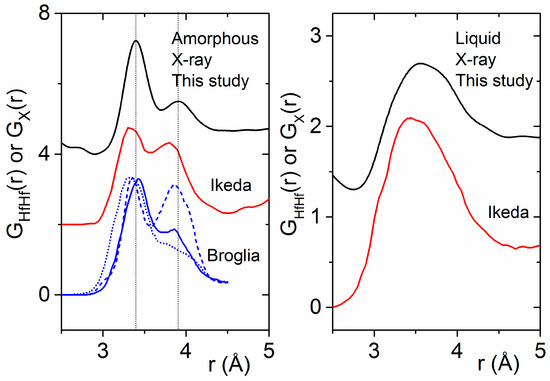 (Left) Comparison of the experimental X-ray pair distribution functions for amorphous HfO2 (black) with DFT simulations of the Hf–Hf partial pair distribution function taken from the literature [1,8]. Densities of 8.6, 10.19, and 11.5 g∙cm−3 are denoted by blue dashed, solid, and dotted lines respectively. (Right) The same comparison made for liquid HfO2.