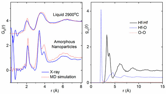 (Left) X-ray pair distribution functions of liquid HfO2 compared to the ab initio simulations performed in this study (shifted top, see text) and amorphous hafnia nanoparticles compared to the classical MD simulations performed in this study based on the parameters given by Broglia et al. [1]. (Right) The partial pair distribution functions for the amorphous nanoparticle simulation weighted by the Q = 0 factors for the X-ray case given in Equation (1).