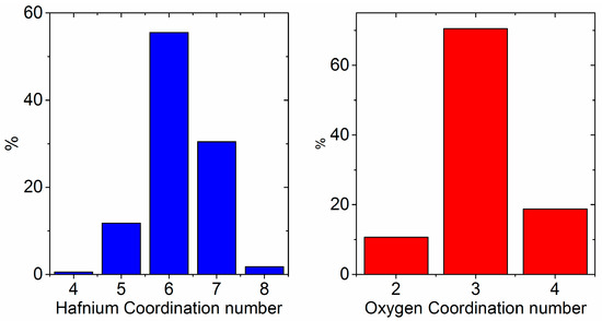 Probability distribution of coordination numbers corresponding to the local environments of Hf and O in amorphous HfO2 nanoparticles.