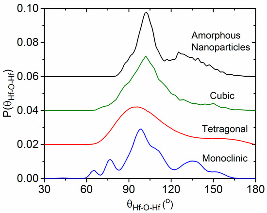 Distribution of bond angles monoclinic, tetragonal, and cubic HfO2 structures obtained from molecular dynamics simulations.