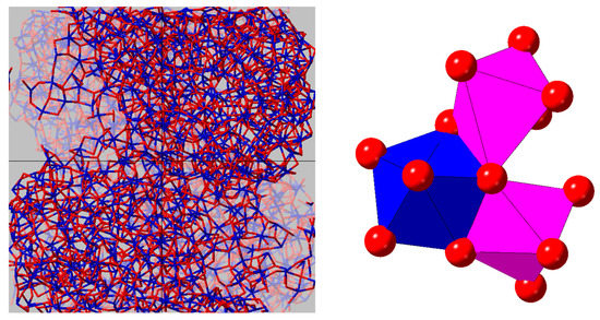 Snapshots taken from the MD model of amorphous hafnia nanoparticles: (Left) the agglomeration on nanoparticles within the simulation box; and (Right) edge- and corner-sharing HfOn polyhedra in the low density amorphous form.