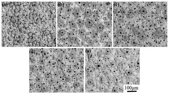 Figure 1 displays the surface morphology of MAO coatings at different KMnO4 concentrations. Obviously, all coatings exhibited typical porous structures with many micro pores on the surface, which are thought to be formed by the residues of the discharge in the MAO process [12,13]. However, there are great differences among their surface morphologies, as shown in Figure 1. It can be seen that there are many foam-like protrusions on the surface of the coating without the addition of KMnO4, while other surfaces are very smooth and compact [12]. The surface roughness of the MAO coatings was determined by their surface microstructures, especially the foam-like protrusions. The producing of foam-like protrusions caused by the electro deposition of silicate played the leading function in the MAO process [12]. The addition of KMnO4 inhibited the sintering reaction of silicate on the substrate surface, which resulted in the reduction of surface roughness by reducing the amount of silicate deposition. However, the surface roughness of the MAO coatings increased, subsequently, with the continued addition of KMnO4, which was due to the increase of film thickness. Some large discharge holes, and quite a lot of small discharge holes, were distributed on the surface of MAO coatings; their diameter exhibits huge differences, and the number of small discharge holes is much greater than that of the large ones for the same MAO coating. The diameter of the large holes showed no significant differences for the different coatings, which was ascribed to the two-step constant-pressure control method of oxidation. When the voltage was decreased, the current density and the oxidation also dropped, leading to the original discharge hole becoming smaller. The oxidation process was mainly caused by small discharge holes, which was beneficial to improving the density of the micro-arc oxidation film layer.