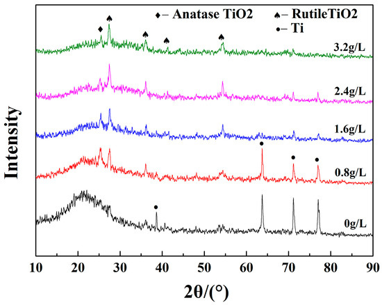 The XRD diffraction patterns of the MAO coatings are shown in Figure 3; it can be seen from the figure that anatase-TiO2, rutile-TiO2 and Ti phases are present in the MAO coatings. The characteristic peak corresponding to Ti that appeared at high angles was due to the orientation growth of the crystal. The diffraction peaks of rutile TiO2 and anatase TiO2 became sharper with the increase in KMnO4 concentration, and therefore indicated that the crystallinity of the coatings changed to a better trend. In the course of solidification, TiO2 formed crystalline phase easily, and it was difficult for the amorphous phase to form by rapid cooling because of its high critical cooling rate. It can be inferred that Mn, P and Si elements existed in amorphous form, since the characteristic peaks of the compounds of Mn, P and Si elements were not detected. The amorphous phases were formed when the electrolyte was instantly cooled, and their existence was beneficial to improving the toughness and corrosion resistance of the MAO coatings.