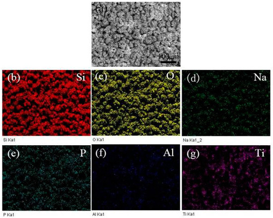EDX mapping results of the sample prepared with 0 g/L concentration of KMnO4: (a) SEM morphology; (b) Si; (c) O; (d) Na; (e) P; (f) Al and (g) Ti.