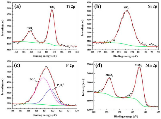 Since XRD is only able detect the existence of the crystals, we collected high-resolution XPS spectra of Ti, O, Si, P and Mn elements to confirm the chemical state of the elements in the coatings. The XPS spectra of the MAO coatings at KMnO4 concentration of 3.2 g/L are presented in Figure 7. As shown in Figure 7a, the peak of Ti2p at 458.7 eV was separately related with TiO2. In Figure 7b the spectrum of element Si2p exhibited one peak at 102.8 eV, suggesting that Si appeared in the tetravalent state Si4+, which was further explained by the fact that Si exists in the coating mainly in the form of SiO2 [16]. The P2p peak was well fitted at 134.1 eV and 133.3 eV in Figure 7c, which can be attributed to PO3− and P2O74− [16,17,18,19]. The P2O74− could combine with Na+ to form Na4P2O7, and this conclusion is in good agreement with Hou’s report [19]. The spectrum of element Mn2p exhibited apeak at 642.4 eV (Figure 7d), implying that the Mn element existed in the form of MnO2 in the coatings [20].