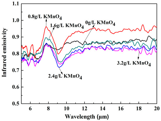 The infrared emissivity curves for MAO ceramic coatings with a range of 5–20 μm relative to the blackbody are shown in Figure 8. It can be seen that the infrared emissivity of the MAO coatings first increased as the KMnO4 concentration increased, then the trend changed to a decrease. The maximum infrared emissivity was found for the coating with 0.8 g/L KMnO4, and this was significantly higher than the non-added coating, and the value was up to 0.92 greater than the 10 μm band. With greater addition of KMnO4, the emissivity of the coatings was significantly lower. Generally speaking, the emissivity was highly influenced by surface roughness and thickness, chemical composition and phase structure. In general, the emissivity increased with the increase of roughness and thickness [21,22]. However, these were not the leading factors in determining the change of emissivity, based on the test data of this research.