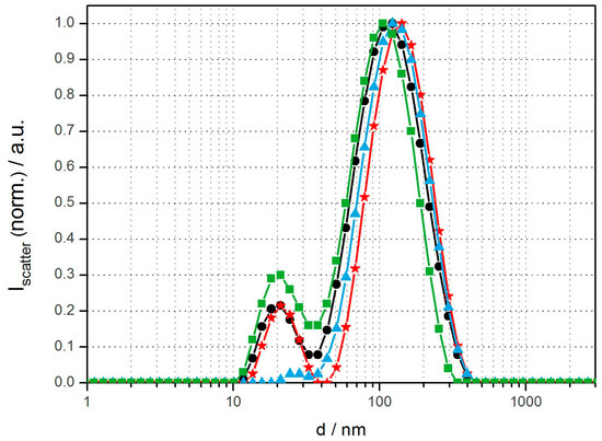 DLS size distributions of various magnetopolymersomes (10% w/w SPION) prepared via solvent inversion at 2 mg/mL plus homogenization via extrusion through 100-nm polycarbonate membranes (Avestin): PBD(1200)-b-PEO(600)-OH (black), PBD(1200)-b-PEO(600)-COOH/b-PEI(800) (100% n/n) (red), PBD(1200)-b-PEO(600)-DEDETA (50% n/n) (blue) and PBD(1200)-b-PEO(600)-OH/DOEPC (30% n/n) (green).
