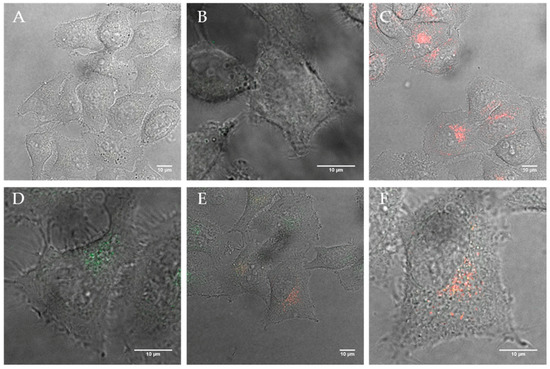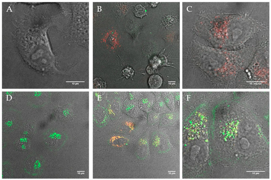 Sub-cellular co-localization studies were conducted by staining HeLa for specific cell compartments with CellLight® for 20 h. The stain expresses a red-fluorescent protein tag (RFP) fused to a signaling peptide, here lysosomal associated membrane protein 1 (lamp1), which provides specific targeting of cellular lysosomes. 12 h incubation with cationic polymersomes at 300 µg/mL and staining exhibits co-localized fluorescence near the nuclei (red—lysosomes and green—PBD(1200)-b-PEO(600)-DEAC in Figure 2). This result implies internalization of polymersomes into lysosomes.
