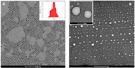 Superparamagnetic iron oxide nanoparticles were prepared through thermal decomposition of Fe(CO)5 in the presence of oleic acid to control their size and morphology; the resulting SPION were subjected to a rigorous protocol for ligand exchange to produce hydrophobic SPION irreversibly grafted with a dense shell of palmityl-nitrodopamide (P-NDA), as previously reported [40]. Figure 4A shows TEM micrographs of the synthesized SPION with a narrow size distribution of 5.0 ± 0.4 nm.