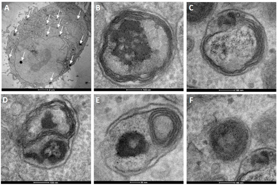 TEM ultrathin sections of HeLa cells after 12 h incubation with cationic fluorescent magnetopolymersomes. Vesicles (50% PBD-b-PEO-COOH; 2% DEAC) containing 10% w/w SPION were formed at 2 mg/mL via solvent inversion and subsequently coated in 10× b-PEI(800) before being purified by gel permeation chromatography. Overview in (A) shows elevated levels of cationically modified magnetopolymersomes taken up (black spots indicated by arrows). The sequence (B–F) shows higher magnification images of the apparent progression of hydrolytic degradation of SPION-loaded polymersomes after internalization.