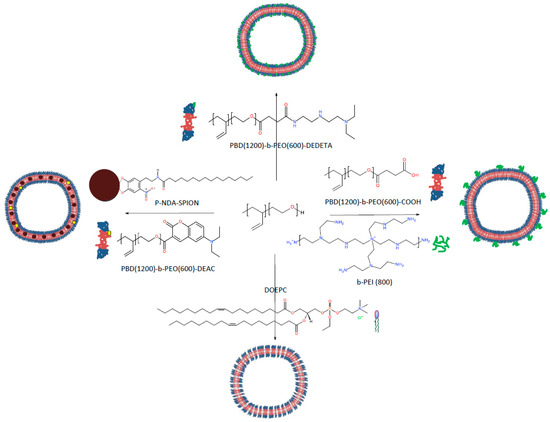 - Le Meins, J.-F.; Schatz, C.; Lecommandoux, S.; Sandre, O. Hybrid polymer/lipid vesicles: State of the art and future perspectives. Mater. Today 2013, 16, 397–402. [Google Scholar] [CrossRef]