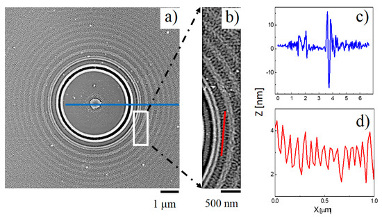 As the expanded view in the Figure 1b shows, the outer NF-S rings and the intervening annular regions exhibit complex surface ripple structures, with a discernible periodicity in the angular coordinate within each ring. The cross-sectional AFM analysis shows a periodicity Λ ~ 70 nm, with half-pitch resolution as small as 30 nm, indicating that these belong to the class of deep-sub-wavelength ripples (DSRs) with a period to laser wavelength ratio in the domain Λ/λ < 0.4 []. The average ripple height of these DSRs, an important parameter in the field of nano-etching, is ~2 nm (formed in a single-shot exposure).