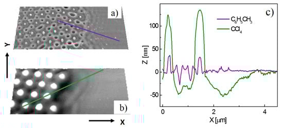 The substrate was continually translated during these experiments, ensuring that the irradiated areas were equally spaced, but there is no necessity that these processed areas be centered on regions covered by localized colloidal arrays. Areas chosen for particularly close analysis in the present work were those where the center of the (near-Gaussian) laser intensity profile straddled the boundary between masked and bare regions of the substrate. Figure 2a,b shows local maxima (white) corresponding to the centers of the particles in the close packed array that constituted the colloid mask prior to LILAC processing in C6H5CH3 and CCl4, respectively. As noted previously, the observation of these localized features implies that the substrate under the particles is affected by the irradiation process. Our previous high-resolution transmission electron microscopy analysis of these features indicated the polycrystalline nature of the Si in this region []. Cross-sectional AFM analysis (Figure 2c) shows these maxima peaking ~25 nm above the neighboring surface. The rest of the surface profiling is again concentrated just outside the area eclipsed by the colloidal particles (as expected, given ncolloid < nliquid) and can be understood as the superposition of, primarily, the NF-LA rings associated with neighboring particles. The largest craters (the black features in Figure 2a, attributable to the overlap of NF-LA rings from three adjoining particles) appear as a hexagonal lattice, reflecting the close packing in the original colloidal mask.