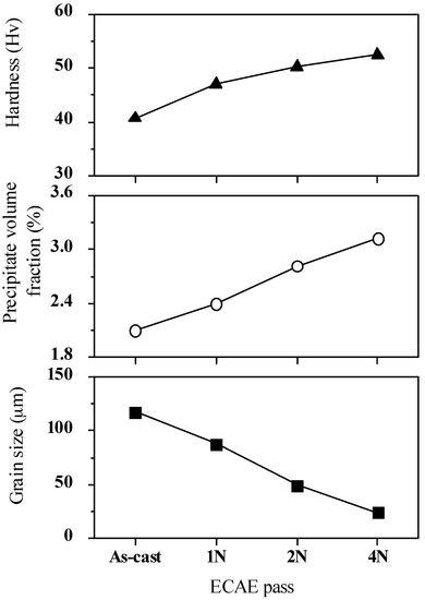 The relation among the grain size, the precipitate fraction of Mg2Sn, and the hardness of the Mg-Sn alloys after ECAE processing were investigated in Figure 3. The highest hardness, 52.5 Hv, could be obtained in the Mg-Sn alloy with four-pass ECAE processing, for which average grain size was 24.4 μm and the precipitate fraction was 3.12%. The enhancement of the hardness was attributed to the grain refinement and the precipitation of the second phase, Mg2Sn, after ECAE processing. A larger amount of grain boundaries and precipitates would disturb the movements of the dislocations, leading to the increase of the hardness.