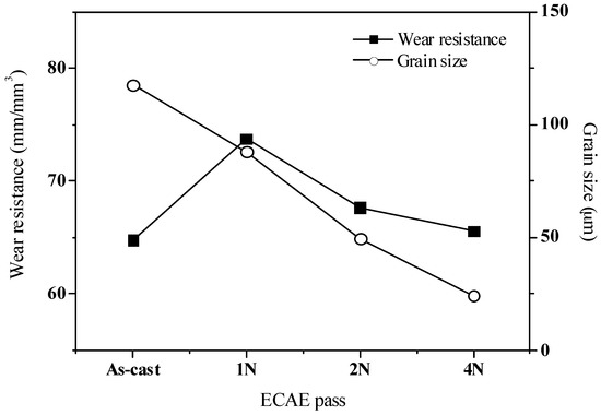 We have shown that grain size refinement, the precipitate of the harder second phase, and the effect of oxidation on the surface seem to be the dominant factors affecting the wear resistance of ECAE-processed alloys. Combining the contributions of these three factors could explain why the maximum wear resistance was obtained at the alloy undergoing the one-pass ECAE process in this study.