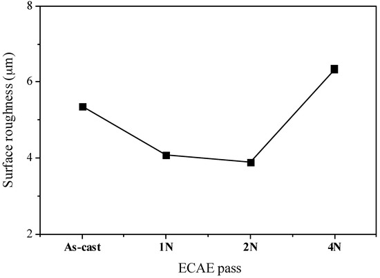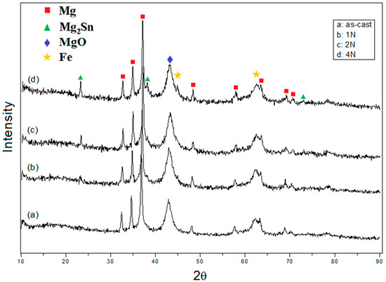 In order to investigate the wear mechanism, the surfaces of the alloys after sliding were examined by SEM. The worn surfaces of the Mg-Sn alloys showed diverse topographical features, as seen in Figure 5. Figure 5a shows the obvious scratches due to the abrasive wear on the worn surface of the as-cast alloy. Moreover, the marks of adhesive wear with the plastic deformation were observed near the region of the ploughing. As the grain size reduced to 88μm, leading to the increase of the strength, the worn surface of the one-pass ECAE-processed alloy in Figure 5b showed abrasive damages such as the microcutting and ploughing of the solid without the plastic deformation. Therefore, the main wear mechanism was the abrasive wear in the alloy with one-pass ECAE. When the grain size continued to refine, the influence of the surface oxidation appeared gradually. The surface oxidation rate increased with the increase of the ECAE pass number and a three-body abrasive wear tended to take place during sliding. Meanwhile, more precipitates produced and acted as asperities that were presumed to fracture easily. The abrasive components in the form of particles or thin flakes were trapped between two surfaces (pin and disc) in relative motion. The generation of fatigue cracks after repeated stress was attributed to the surface traction and the plastic deformation. The cracks propagated parallel to the surface, delaminated, and formed loose debris. Therefore, there were many cavities and craters with irregular shapes on the worn surface of the four-pass ECAE-processed alloy, as shown in Figure 5d. Figure 6 shows the surface roughness of the worn surfaces of the as-cast and ECAE-processed alloys. The as-cast alloy with the grain size of 117.6 μm easily exhibited deep grooves during sliding due to the soft matrix. The roughness of the as-cast alloy was measured as 5.47 μm. After ECAE processing, the grain size reduced, the precipitate increased, and the surface oxidation occurred gradually during sliding. The main wear mechanisms became the abrasive wear and the oxidative wear. Therefore, the worn surface was smoother than the as-cast alloy and the surface roughness decreased to around 4 μm. On the four-pass ECAE-processed alloy, delaminations and fractures due to the severe fatigue and oxidative wear were observed. As a result, the surface roughness was increased to 6.5 μm. Wear debris produced during the wear test were collected and examined using XRD. Figure 7 presents the XRD spectra from the wear debris of the as-cast and ECAE-processed alloys. The debris had a significant signal of MgO oxide, suggesting that evident oxidation had occurred during sliding. Moreover, the iron peak from the counter material by the abrasion was found in the four-pass ECAE-processed alloy due to the increase of the precipitate fraction and the appearances of a large number of MgO oxides.