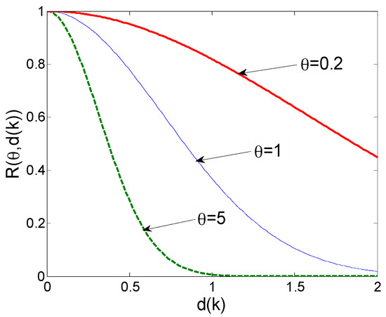 From the Gaussian function curves shown in Figure 3, the correlation between sample points shows a downward trend with the increase of distance. It is observed that the larger the value is, the smaller the correlation area, namely, the faster the correlation declines. For the smaller value, the correlation between two points is greater when the distance increases, which means that the response values of two points farther apart show an insignificant difference. Therefore, is generally regarded as a measure of the importance of independent variables, whose selection directly affects the accuracy of the model.