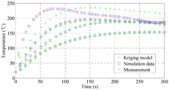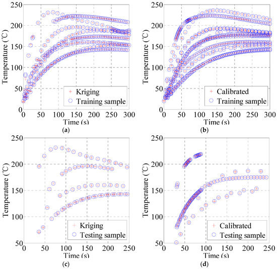 In order to investigate the difference between the simulation and experimental data, a comparison study of prediction and measurement data is conducted. Figure 5 shows the temperature responses of the full sample points and the corresponding predicted values from both the initial and calibration kriging models. Figure 5a,b compare the predicted values of the two kriging models with the corresponding training samples. Similar to Figure 4, the prediction values of the two kriging models show better continuity and consistency with the sample data. However, from Figure 5a, it is clearly observed that the consistency of a few points data in the first 50 s is relatively low, and the maximum temperature error is 7.8 °C. Figure 5b is the predicted curve of the calibrated model. It is observed that the average temperature error and variance are less than 0.5. Also in comparison to the initial kriging model data shown in Figure 5a, the calibrated model produces less individual errors in the first 30 s with the maximum temperature error of 3.9 °C. This study demonstrates that the accuracy of the kriging surrogate model has been improved by calibration with experimental samples.