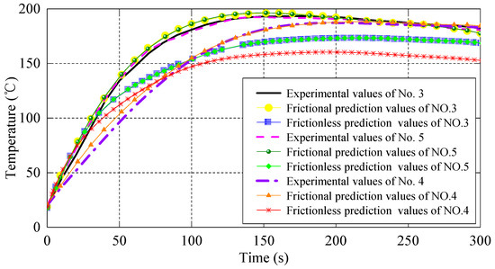 Figure 7 shows the temperature variation of the punch and the shot sleeve in section A predicted by the kriging surrogate model, where No. 3 and No. 5 represent the temperature variation of the shot sleeve, and No. 4 represents the temperature variation of the punch. Comparing the overall temperature curve of the punch and the shot sleeve, it is observed that the temperature of the shot sleeve is higher than that of the punch, and the former increases faster than the latter. This would be attributed to the different material properties and thermal conductivity of the two components. Under friction, the predicted values of the shot sleeve temperature are in good agreement with the experimental data. However, when ignoring friction, the maximum relative error is about 15%, which is much bigger than the value under friction, i.e., 5% at about 150 s. The similar observations are obtained from the punch temperature prediction. This study further indicates the influence of friction on the injection process.