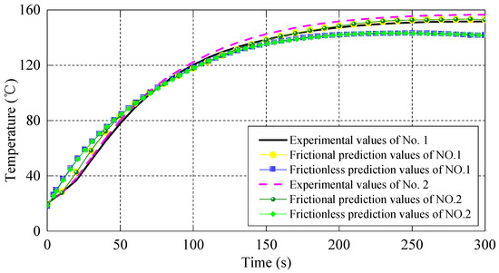 Figure 8 shows the temperature curves of the punch in section B. It is observed that the temperature variation trend of all six curves is consistent. Considering friction, the predicted values are more in agreement with the experimental data than those without considering friction. Similarly, at the beginning of the injection process, there is a significant temperature error between the predicted and experimental data, and then the relative error decreases gradually with the value close to 1%.