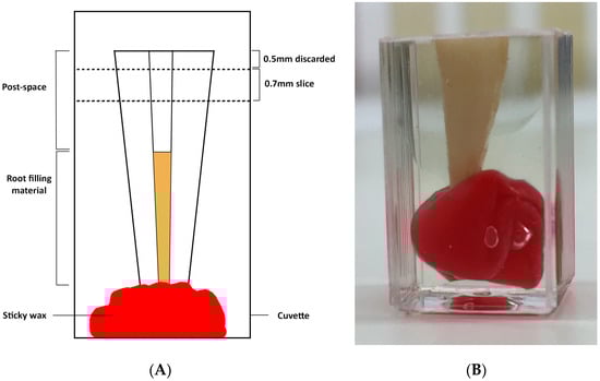 (A) Schematic diagram of a root mounted in a cuvette with the location of the 0.7 mm slice shown; (B) The sample after removing 0.5 mm from the coronal surface, just before taking the 0.7 mm slice.
