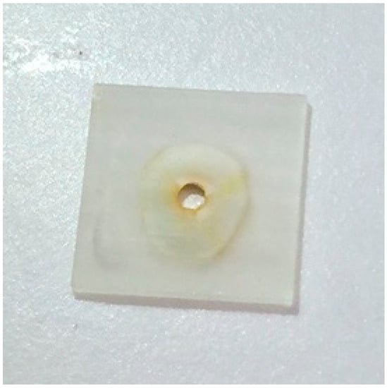 The roots were then placed upright into a standard clear plastic spectrophotometer cuvette and held in place with wax attached at the apex. Clear epoxy resin (Presi MA2+™, Kemet, Marayong, NSW, Australia) was introduced into the root canal with an irrigating needle and syringe to prevent voids in the post space, and the cuvette then filled with the same epoxy resin to submerge the root. After allowing the resin to set for 24 hours at room temperature according to the manufacturer’s instructions, the embedded roots were sectioned horizontally using a diamond saw (IsoMet™ 1000, Buehler, Lake Bluff, IL, USA). A 0.7 mm thick slice was taken 0.5 mm below the coronal surface (Figure 2).
