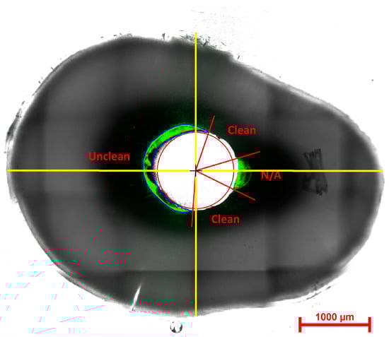 Composite bright field and fluorescence image showing the method for assessing canal walls for remnant sealer or cement and measuring eccentricity. The red circle shows the outline of the ParaPost™ drill. The centre of this circle marked with a crosshair was used to align the protractor for angular measurements. Remaining GP appears as a shadow outlined in blue. Regions on the circumference of the drill were classified as clean, unclean or non-accessible. Green areas are sodium fluorescein-tagged remnants of sealer or cement on the canal walls, marked as unclean. Areas designated as non-accessible (N/A) cannot be reached by the ParaPost™ drill. The yellow lines crossing perpendicularly at the crosshair are the major axis and minor axis lengths taken to calculate eccentricity.