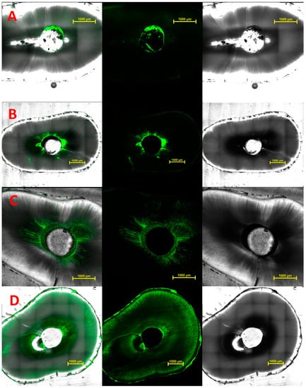 The coronal root slices (Figure 3) were examined under a confocal laser scanning microscope (CLSM) (Model C2+, Nikon Instruments Inc., Melville, NY, USA) using 488 nm wavelength laser excitation. Samples were imaged using a ×10 objective lens, and high-resolution composite images made to encompass the entire cross-sectional area of the root.