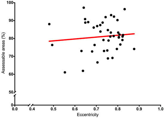 Linear regression plot of the measured eccentricity of the root versus the assessable area of a root canal of the same tooth in percentage, showing the line of best fit.