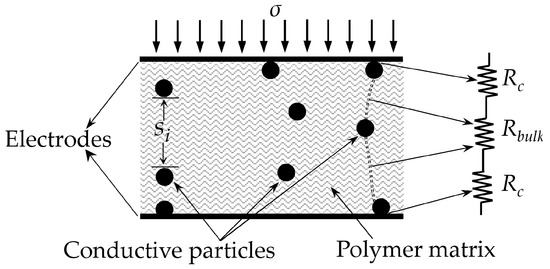 Figure 3 depicts the interactions occurring at a microscopic level between the metal electrodes and the conductive particles. For incremental values of stress, the number of contact paths grows; this implies that the effective area for tunneling conduction must be stress-dependent. In authors’ previous work [30], it was proposed and tested the following model for the effective area, A: