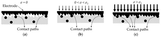 Figure 3 depicts the roughness of surfaces at a microscopic level under null, small and large stress conditions. A similar sketch has been presented by Kalantari et al. [22]. At the null loading and small loading stages, see Figure 3a,b, only a few contact paths are formed between the top metal electrode and the conductive particles. Under this scenario, the Mikrajuddin et al. model [38] for the contact resistance can be certainly employed because Rc ∝ σ−1/3 or Rc ∝ σ−1 depending on the interaction type (plastic or elastic). However, with the application of a sufficiently large stress, see Figure 3c, new contact paths are formed, and thus, the fixed coefficients (−1/3 or −1) fail to provide a valid representation of the contact resistance.