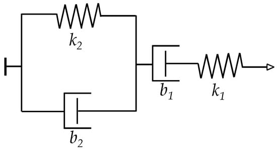 Some authors have employed the Zener element from Figure 4 to model the creep behavior of FSRs [22]. Some others have chosen the Burgers model [42,43] instead. In this study, the more general Burgers model is employed. When required, some elements from the Burgers model are discarded to yield the simpler Zener model. Figure 5 shows a sketch of a Burgers element with corresponding symbols k1, k2, b1 and b2.