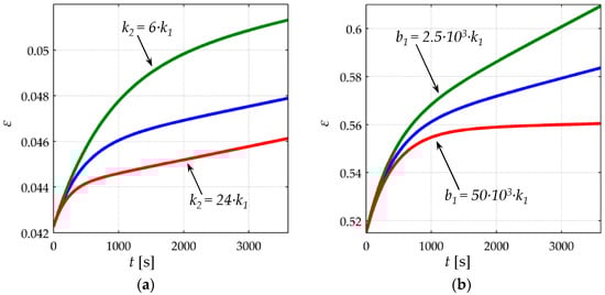 Simulated data for the creep of strain ε(t) for the (a) FlexiForce A201-1 [23] and (b) Interlink FSR 402 [24] sensors when loaded to σ = 200 KPa. Blue lines: simulations obtained on the basis of the Burgers model with parameters k2 = 12·k1, b1 = 5 × 103·k1 and b2 = 72 × 103·k1, where the compressive modulus of each sensor (k1) was taken from Table 1. Green and red lines: creep of strain is plotted for modified values of k2 and b1, where the rest of parameters have remained unchanged.