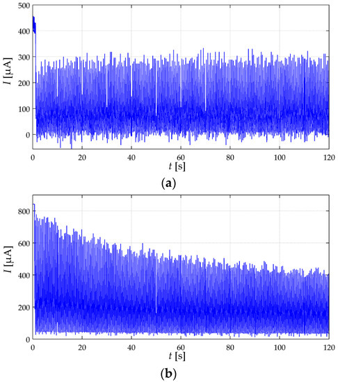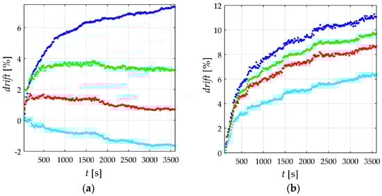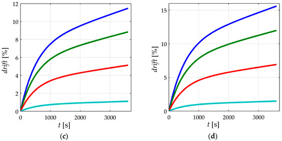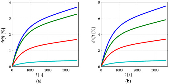 where drift(t) is the normalized current drift in percentage, I(t) is the sensor current estimated on the basis of Equations (19)–(21), and I(0) is the sensor current immediately upon the application of stress, i.e., I(0) is obtained by substituting t = 0 in Equations (19)–(21).