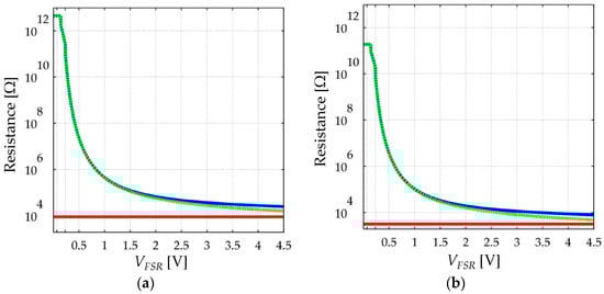 An alternative method to obtain repeatable measurements is to employ a source meter unit, such as the Keithley 2635A, or a digital electrometer, such as the Keithley 6517A or the Keithley 6487. Source meter units and electrometers apply a fixed test voltage to the unknown resistance and measure the resulting current, so if VFSR is chosen accordingly, it is possible to avoid sensitivity degradation. It must be highlighted that even if sensitivity degradation is not observed, different resistance readings are yielded by simply changing the test voltage or the test current; this has been simulated and plotted on Figure 8. Therefore, when performing measurements over FSRs and CPCs, it is important to specify VFSR in order to ensure the repeatability of results in future studies. The usage of the Keithley 2635A and Keithley 6517A instruments has been reported by Canavese et al. [3,10] and by Cattin and Hubert [27], respectively. Similarly, Liu and Schubert have employed the Keithley 6487 picoammeter to measure sensors’ resistance [61].