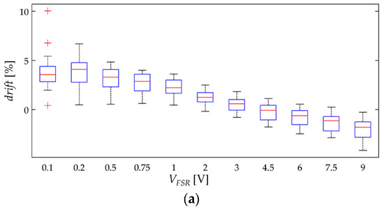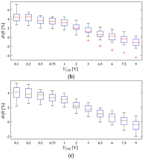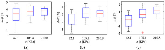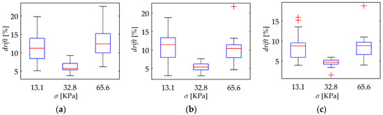 Box plots for the drift of sensor current after one hour of operation, drift(t = 3600 s), when operating at different stresses, σ. Drift data calculated from Equations (22) and (23) for sixteen FlexiForce A201-1 sensors at (a) VFSR = 0.5 V, (b) VFSR = 1 V and (c) VFSR = 4.5 V.