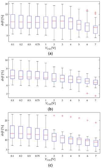 Box plots for the drift of sensor current after one hour of operation, drift(t = 3600 s), when operating at different stresses, σ. Drift data calculated from Equations (22) and (23) for sixteen Interlink FSR 402 sensors at (a) VFSR = 1 V, (b) VFSR = 4 V and (c) VFSR = 7 V.