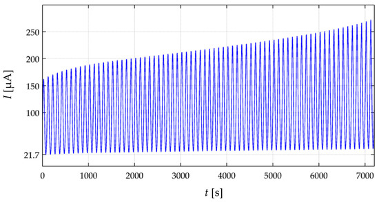 Simulation plot of sensor current, I(t), when loaded to σ(t) = 200 KPa + 100 KPa·sin(2π10−2t) for two hours at VFSR = 6 V.