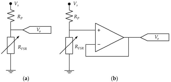 Figure 17 shows sketches of FSRs driven by voltage dividers using unbuffered and buffered outputs. Under such scenario, the voltage drop across the sensor changes accordingly to the applied stress. If VS is chosen to be 5 V (as in many applications involving microcontrollers), the applied stress may produce a VFSR that causes sensitivity degradation in the device, i.e., if the applied stress is sufficiently large, VFSR may swing from a few millivolts up to 5 V. This set-up unavoidably yields sensitivity degradation in the device thus affecting the repeatability of results. A similar analysis is yielded if a multimeter is employed to readout sensor resistance. For such reasons, the authors discourage the usage of multimeters and voltage dividers to measure the resistance of FSRs, and instead, the authors encourage the usage of amplifiers in inverting configuration with VFSR held below 2 V.