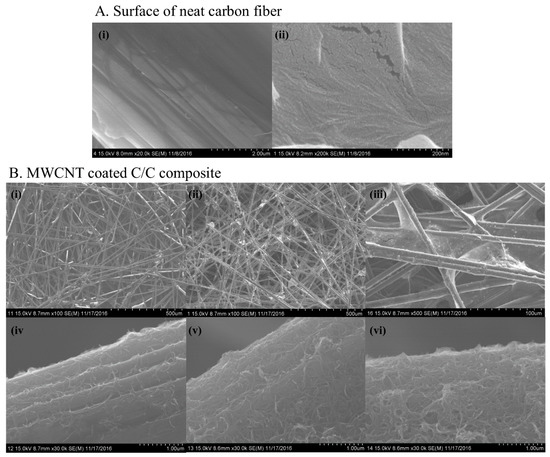 SEM images of surfaces of C/C composites: (A) surface of a carbon fiber in the NCFL (i) annular gaps (×20,000); and (ii) cracks (×200,000); and (B) (i) NCF; (ii) C-5; and (iii) C-10 surface of MWCNT coated C/C composites; and (iv)–(vi) the surface of a carbon fiber of C-1, C-5 and C-10, C/C composites, respectively.