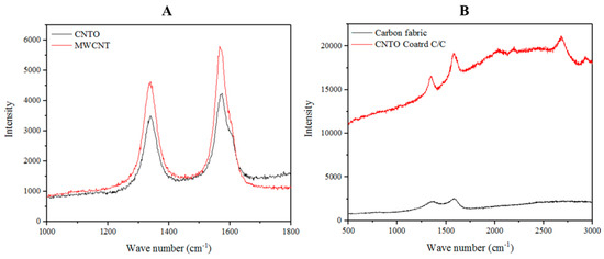 Raman spectroscopy is considered as a sensitive tool for studying the structural properties of carbon materials. Raman spectra provide information about the crystalline nature of graphite-based material [22,23]. The Raman spectra of MWCNTs showed multiple peaks (Figure 2A). MWCNT had a clear D-band at 1299–1393 cm−1 and a distinctive G-band at 1500–1648 cm−1. CNTO which was obtained from oxidizing MWCNT, also displayed almost the same peaks (Figure 2A) as the ones in MWCNT. Both spectra showed the D’-band as a shoulder of the D-band at 1603 cm−1. This D-band is a disorder related feature arising from double resonance in the Raman scattering process. The CNTO coated C/C composite showed a Raman spectrum derived from both CNTO and Carbon fiber fabric spectra (Figure 2B) and the peak at 2540–2740 cm−1 is related to G’-band [23].