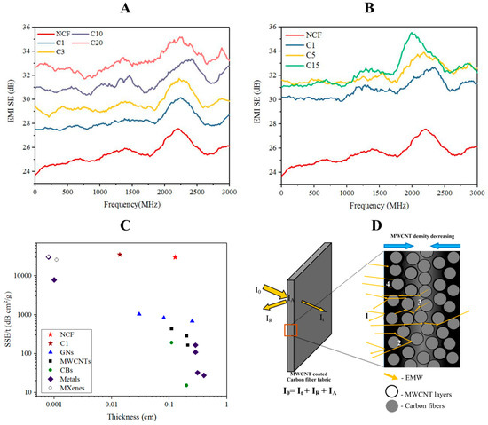The EMI SE of the MWCNT coated C/C composites can be described using several proposed mechanisms. The mechanisms can be explained in a few steps: MWCNTs consist of graphitic structures which was confirmed using Raman spectra (Figure 3D). As electromagnetic waves (EMW) hit the surface of the composite, some of the EMWs are immediately reflected due to the abundant free electrons on the surface of Graphene or MWCNTs [8]. Some of the remaining EMWs pass through the CFs and MWCNT based or CFs based matrices where they interact with the high density of electron clouds in the matrices and induce a current causing Ohmic losses [29]. The remaining EMWs, after passing through the first layer of MWCNT, encounter the next barrier and the phenomenon of EMW attenuation is repeated. Simultaneously the inner layer acts as a reflecting surface and gives rise to multiple reflections resulting in further reduction of the total transmission of EMWs.