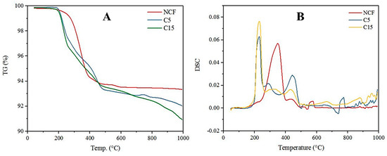 In an oxygen-free atmosphere, degradation of the composites was inhibited up to 284 °C. In contrast, composite degradation occurred rapidly from 300 to 400 °C. All the composites showed less than 10% weight loss up to 1000 °C (Figure 4A). In the DSC curve depicting the neat carbon fabric, an endothermic peak appeared near 356 °C which can be associated with the decomposition of C/C composite [30]. This peak shifted to 223–228 °C and the intensity of the peak increased dramatically in MWCNT coated carbon C/C composites [31]. This may be due to the introduction of SDS and MWCNT in to the NCF. However, MWCNT coated C/C composites exhibit outstanding stability over higher temperatures (Figure 4). Even though overall stability of the samples is relatively high, it is lower than the NCF stability. This might be due to the loss of loosely bound MWCNTs from the surface of the C/C composites.
